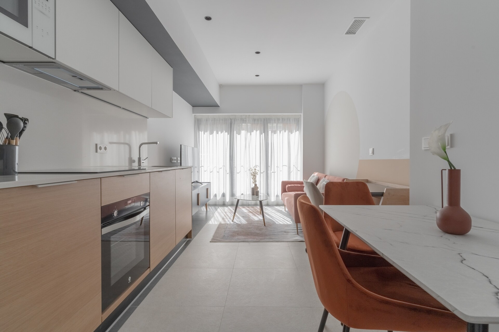 Los huéspedes disfrutarán de una gran experiencia en este este céntrico y moderno apartamento ubicado en un conjunto de 21 apartamentos. El salón cuenta con sofá cama, mesa de comedor, Smart TV y escritorio. La cocina es americana y está totalmente equipada: lavadora, lavaplatos, horno, microondas, vitrocerámica, menaje, etc. El dormitorio cuenta con una cama doble de 190x160cm, y armarios empotrados. El cuarto de baño dispone de ducha y secador de pelo. La red WiFi funciona perfectamente y ofrece cobertura en todo el apartamento, siendo perfecta para trabajar. Además, el apartamento cuenta con aire acondicionado, plancha y tabla de planchar, batidora, tostadora, etc. y se ofrece con ropa de cama y toallas. La entrada en este apartamento es autónoma (mediante el código de acceso que facilitaremos), por lo que se puede llegar en cualquier momento deseado (a partir de la hora de entrada permitida).